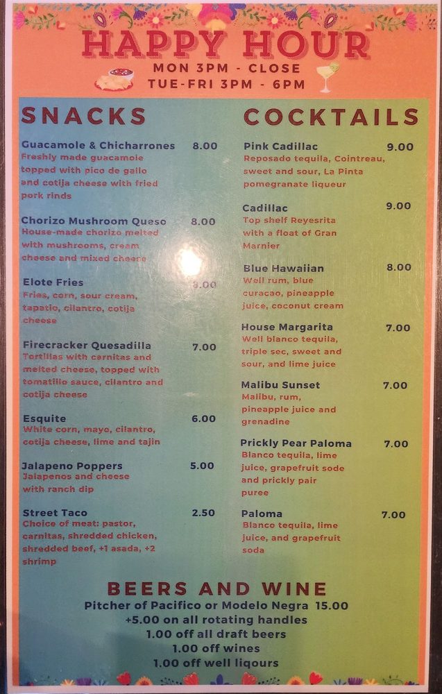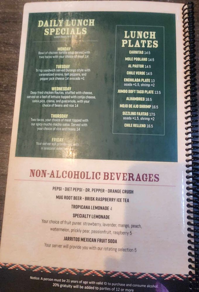 Carnitas $. Mole Poblano $. Al Pastor $. Chile Verde $. Enchilada Plate $. Jumbo Soft Taco Plate $. Alhambres $. Mojo De Ajo Shrimp $. Sizzling Fajitas $. Chile Relleno $.
